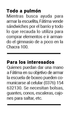 El segundo objetivo nació como un efecto colateral del primero. Para entrenar como la profesionalización lo requiere, Fátima quiere convertir un espacio de su casa en un gimnasio de boxeo. Entonces, se le ocurrió abrir ese gimnasio a todos los chicos de la Chacra 100, donde vive, y enseñarles todo lo que aprendió desde que se inició en el boxeo a los 16 años.