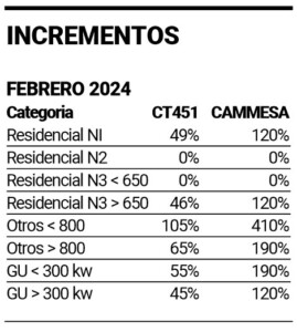 Además de los aumentos que tendrán los usuarios residenciales, también habrá actualizaciones tarifarias importantes para los usuarios comerciales, que en algunos casos llegan al 100% de aumento y también para los grandes usuarios, en baja y media tensión, en cuyo caso, los incrementos rondan el 55%.