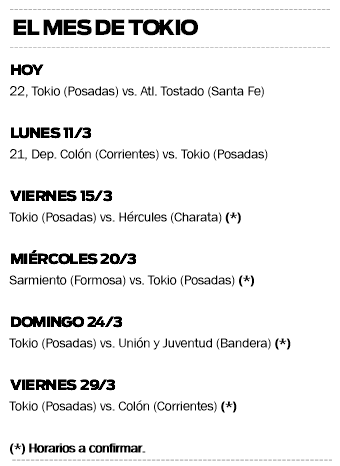 El rival de hoy será Tostado, que anoche debutó ante Colón de Corrientes, lo que supondrá un duro desafío para los santafesinos el hecho de jugar dos veces en menos de 24 horas. Luego de este encuentro, Tokio volverá a jugar el lunes 11, en Corrientes, ante Colón.