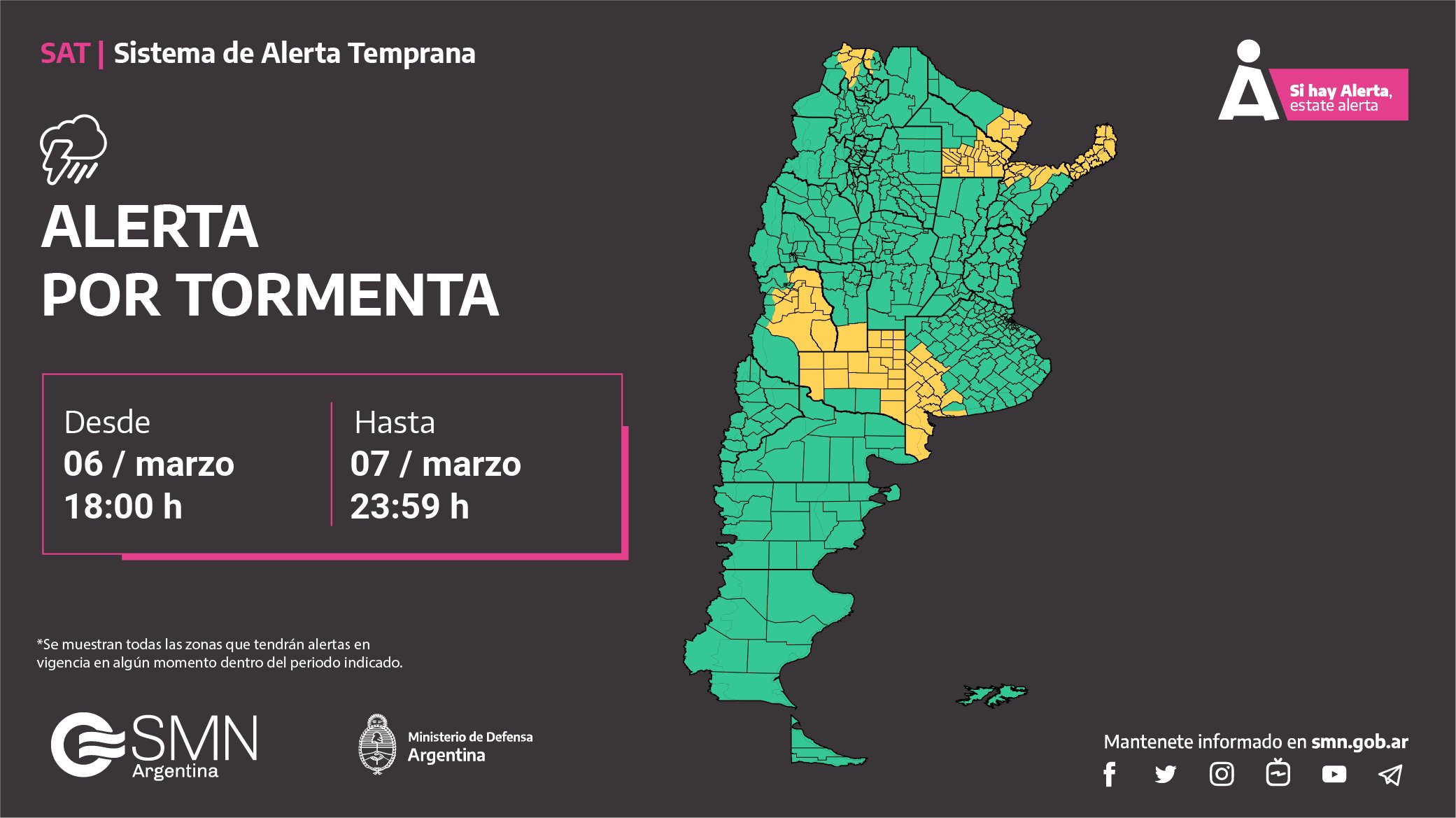 El Servicio Meteorológico Nacional (SMN) emitió una alerta amarilla por tormentas para todo Misiones. La misma estará vigente por todo el jueves 7 de marzo.