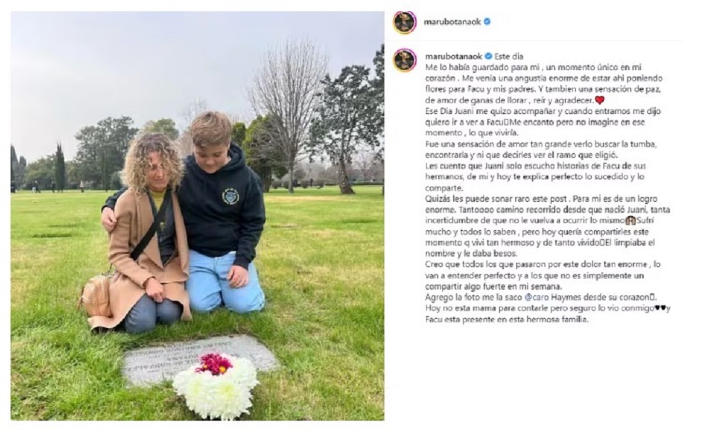Acto seguido, en el texto que publicó en su cuenta de Instagram, Maru relató cómo fue la visita que hizo en los últimos días a la tumba de su hijo. “Este día me lo había guardado para mí, un momento único en mi corazón. Me venía una angustia enorme de estar ahí poniendo flores para Facu y mis padres. Y también una sensación de paz, de amor de ganas de llorar , reír y agradecer”, escribió.