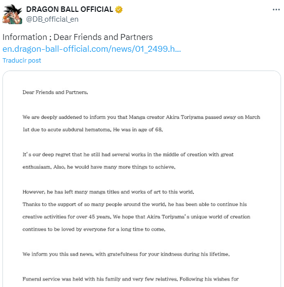 Por estas horas el mundo está conmovido por la noticia sobre la muerte del creador de los populares cómics y dibujos animados. Toriyama falleció el viernes 1 de marzo a los 68 años producto de un hematoma subdural agudo, un tipo de hemorragia cerebral. Señalan que el funeral ya tuvo lugar en presencia de su familia y muy pocos allegados y pidió a sus seguidores no enviar flores o regalos de condolencia.