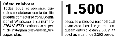 Es así que, “estamos lavando las zapatillas a partir de 1.500 pesos. Después, para blanquear 2.500 pesos, para teñir cinco mil pesos. Luego las cuchas de gatos o perros 2.000 y las colchas a partir de 3.500”, indicó.