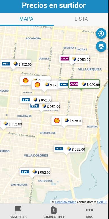 En ese punto se permite localizar las estaciones de servicio con los precios correspondientes; una vez que el consumidor habilita a la app a conocer su localización, se puede elegir qué marcas se quiere elegir.