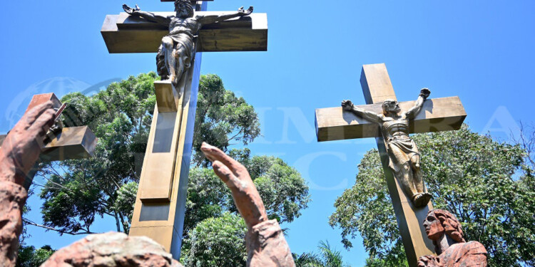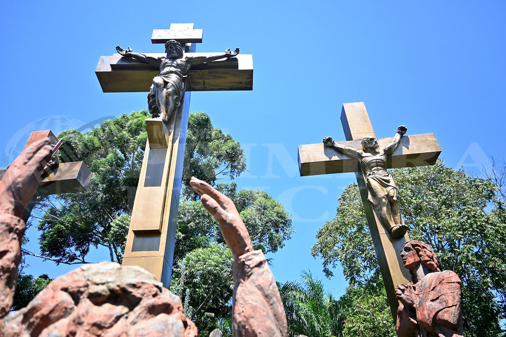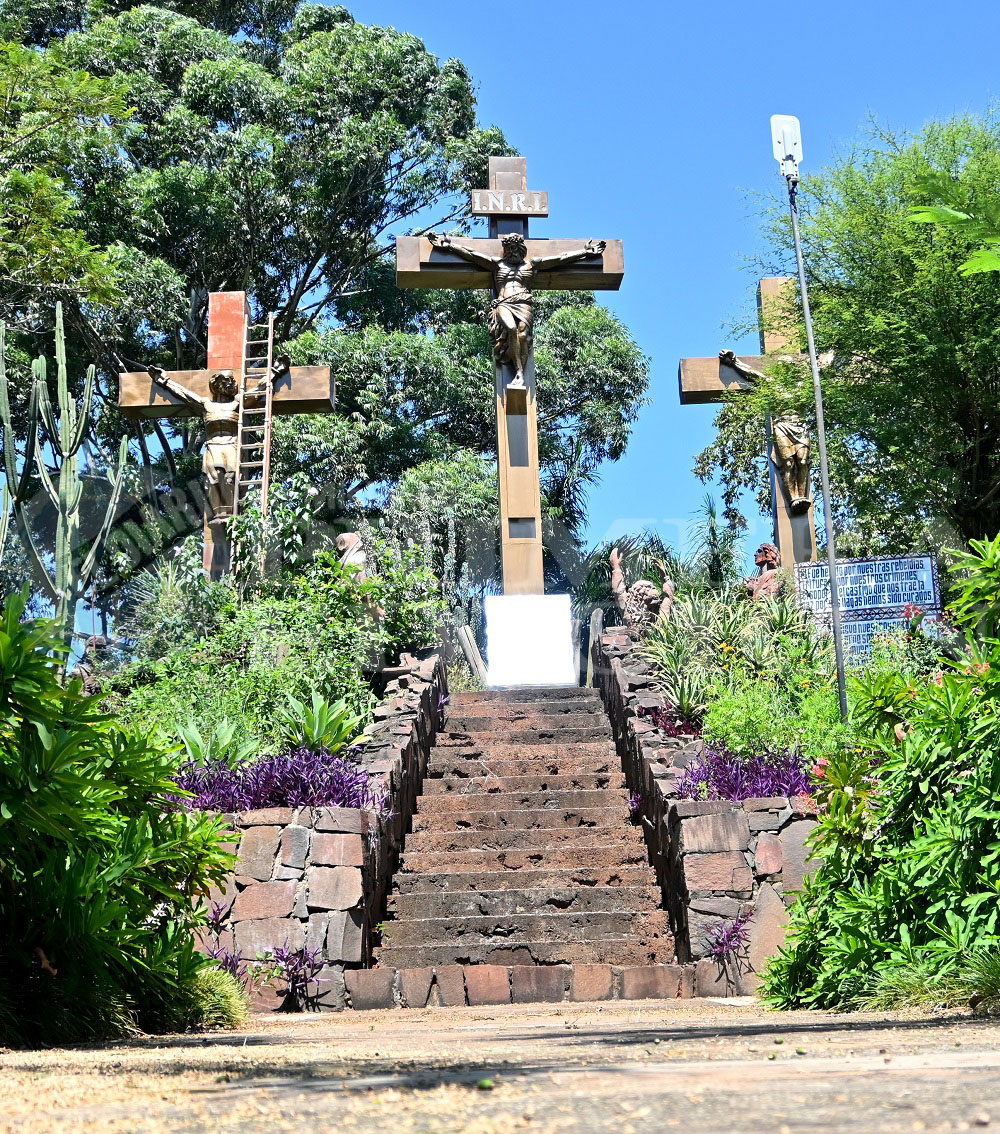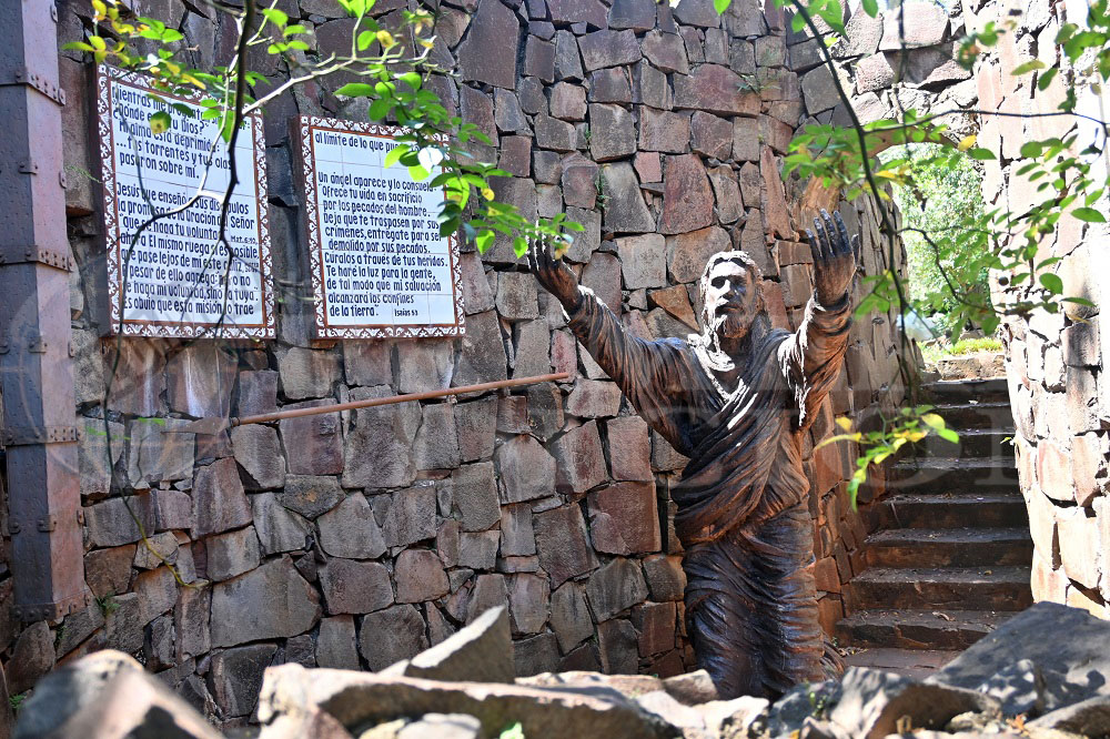 Mencionó que el jardín principal es el del Calvario -una gran montaña de tierra y piedra, que demandó muchísimo trabajo-, que se encuentra en una zona acolinada, desde donde Jesús puede ver a todo su pueblo, por el que entrega su vida y, a la vez, el pueblo también puede verlo. También está inspirado en los escritos de Emmerick, que decía que el Monte Calvario tenía cinco entradas que representaban las cinco heridas que Jesús iba a recibir durante la crucifixión. Se encuentran las tres cruces, con los dos ladrones, y abajo se observan las esculturas de María Magdalena, del apóstol Juan, de María y de los dos soldados que oficiaban de custodia.