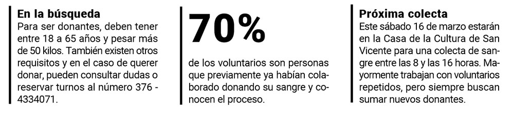Además, se realizan colectas externas los fines de semanas, donde el sábado pasado estuvieron en El Soberbio “donde logramos traer aproximadamente 70 unidades de sangre de donantes voluntarios”. Entre los operativos, este sábado 16 de marzo en la Casa de la Cultura de San Vicente van a estar realizando una colecta de 8 a 16 horas, para extracción voluntaria de donantes.