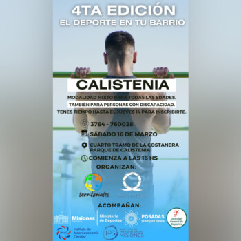 Las inscripciones están abiertas, hasta este jueves 14 debido a los cupos limitados, y se realizan a través del Instagram de la Asociación Civil Territoriales, del team de calistenia Ragnarok o al número de celular 3764760028.