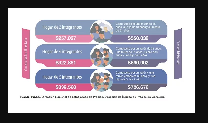 En tanto, un hogar de cinco integrantes (un varón y una mujer, ambos de 30 años, y tres hijos de 5, 3 y 1 años) necesita $339.568 para cubrir el costo de una CBA y $726.676 para contemplar el total de gastos de una CBT.