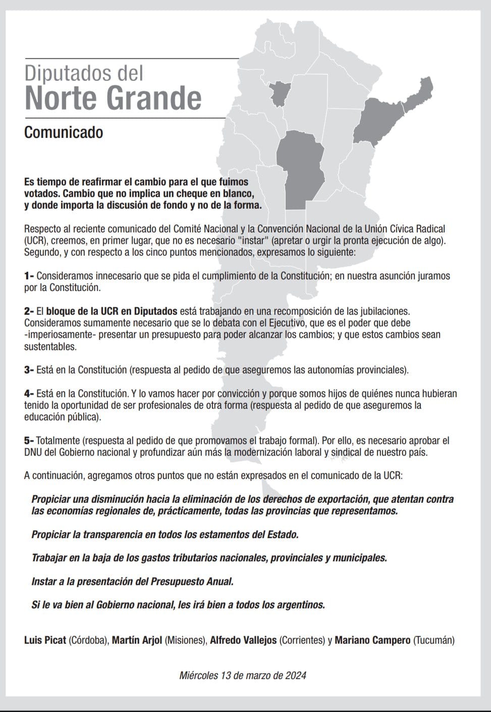 Esto no fue bien tomado por los ‘diputados del Norte Grande: Arjol (Misiones), Luis Picat (Córdoba), Alfredo Vallejos (Corrientes) y Mariano Campero (Tucumán), quienes se desligaron.