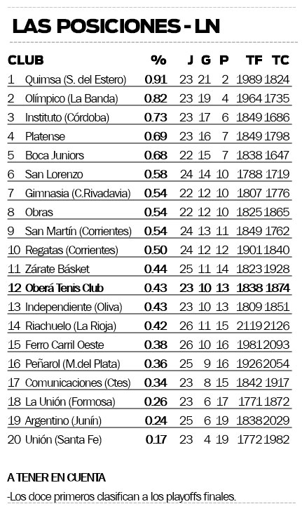 Con estas derrotas, el combinado misionero pasó a tener récord negativo de 10 triunfos y 13 derrotas. Y la situación se agrava si se observa la tabla, donde cayó hasta el duodécimo lugar, el último puesto de clasificación y lo puede perder si es que no logra un resultado positivo. De ahí la urgencia de retornar a la senda del triunfo.