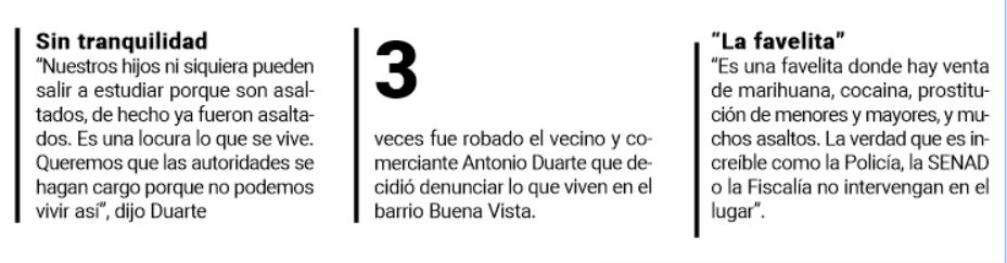 Explicó que hay “una favelita donde hay venta de marihuana, cocaína, prostitución de menores y mayores, y muchos asaltos. La verdad que es increíble como la Policía, la SENAD o la Fiscalía no intervengan en el lugar. Más arriba, hay un tragamonedas, un billar, un prostíbulo que funciona las 24 horas del día. Pero nadie quiere hacer la denuncia por miedo a los ´chespi´. Si quieren investigar, en la mañana, tarde o noche y el amanecer es un supermercado de prostitución y drogas. Una pena”, se lamentó.