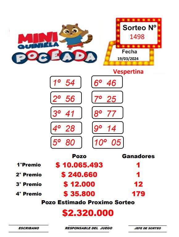 El sorteo 1.498 (vespertina) de la Quiniela Mini Poceada, correspondiente a este martes 19 de marzo, benefició con el primer premio a un apostador de la localidad de Leandro N. Alem.