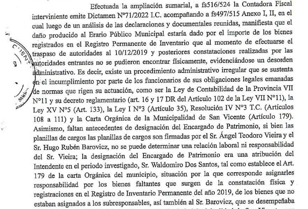 “Asimismo, faltan antecedentes de designación del encargado de Patrimonio. Si bien las planillas de cargos son firmadas por Teodoro Vieira y Hugo Rubén Barovicz, no se puede determinar una relación laboral ni responsabilidad del señor Vieira. La designación del encargado de patrimonio dará una atribución del Intendente en el período investigado. Situación por la cual corresponde asignarle responsabilidad por los bienes faltantes que surgen de la constatación física y registraciones en el registro de inventario permanente del año 2019”, específica.