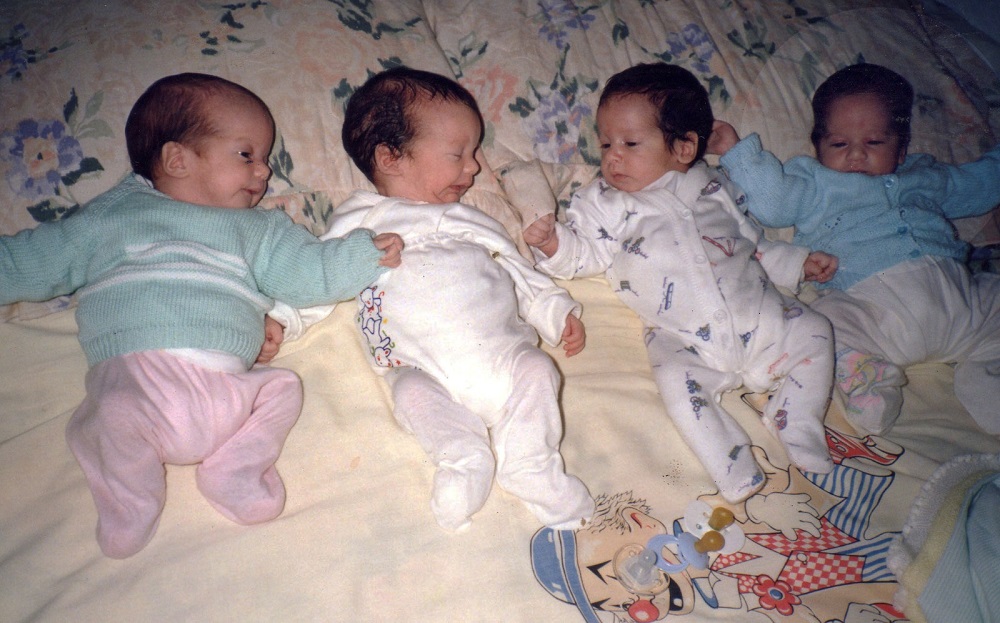 Nayibe Victoria, Omar, Jorge y Miguel llegaron al mundo el 15 de marzo de 1994, después de un tratamiento al que fue sometida su madre. El médico Roberto D’Aloia había confirmado trillizos pero el día del parto, un cuarto bebé hizo su aparición. “A pesar de la sorpresa, fue una muy linda experiencia”, manifestaron orgullosos los padres, Jorge “Coco” Zampaca y Sonia Liliana Maldonado.