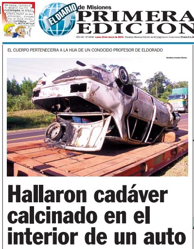 Al día siguiente la policía les avisó del hallazgo de un auto similar al de la joven, volcado, totalmente calcinado y con un cuerpo en el interior. El Renault 18 fue encontrado el domingo 28, a un costado de la ruta 12 y a unos mil metros del puente sobre el arroyo Piray Guazú.
