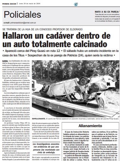 A esa altura de las investigaciones, la policía ya había ubicado su vehículo, un Mazda de color blanco, abandonado sobre una calle céntrica de Eldorado. En el baúl estaban los zapatos de Patricia.