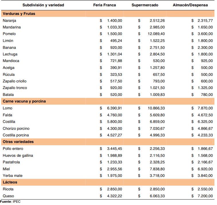 En tanto que de forma contraria la falda (1,9%); la costilla porcina (6,9%); la ricota (11,8%); los huevos de gallina (26,8%); y el pollo entero (84,6%) presentan una diferencia porcentual de precios a favor del Almacén/Despensa.