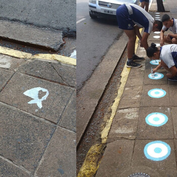 Por ese motivo, esta tarde un grupo de vecinos de la ciudad- principalmente jóvenes, se congregaron nuevamente frente a la sede de la fuerza armada, ubicada a metros de la Plaza 9 de Julio, pleno corazón céntrico de la capital, para volver a pintar el símbolo de las Abuelas de Plaza de Mayo, pero esta vez sobre la calle.
