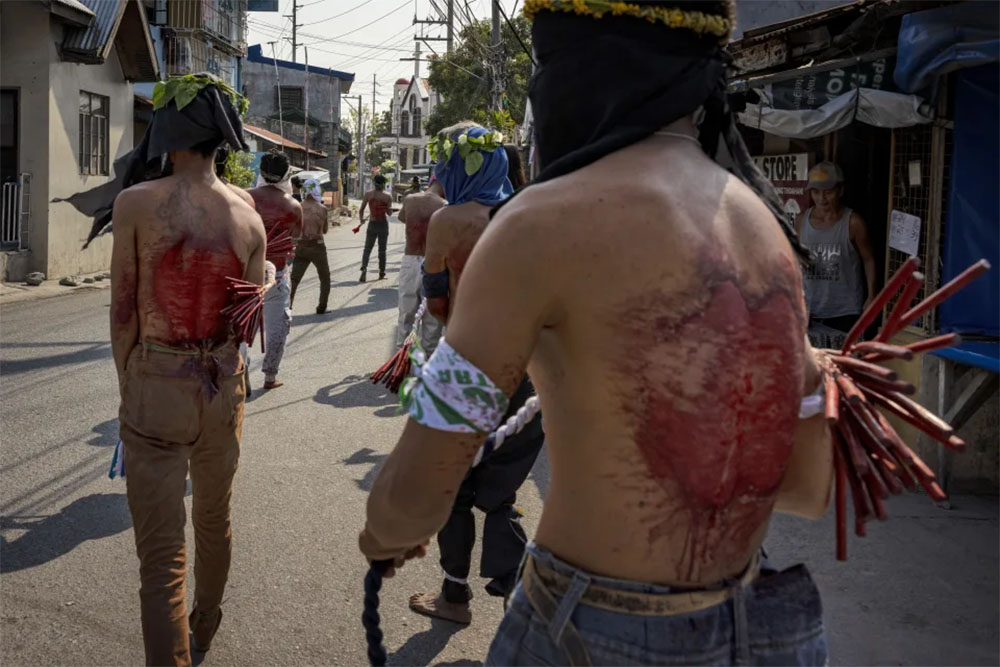 Y aunque la crucifixión es el clímax del intenso ritual, muchos otros penitentes participan en la procesión llevando coronas de espinas o flagelándose en la espalda con trozos de bambú afilados o con ramas que usan como látigos.