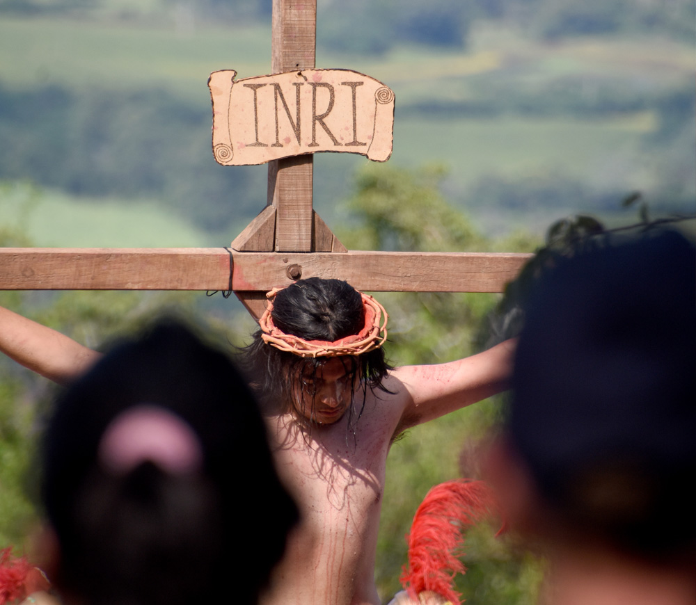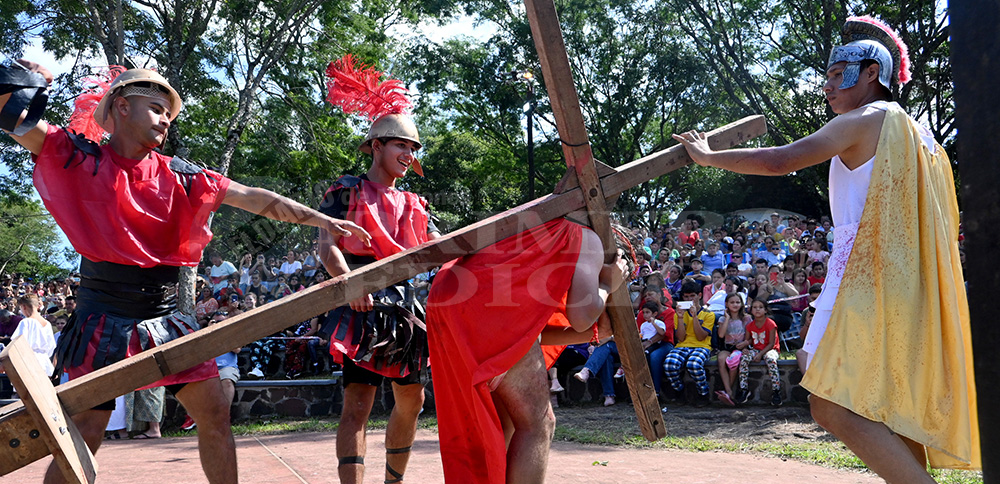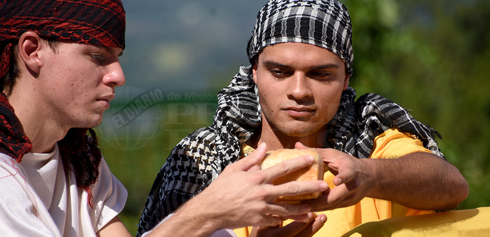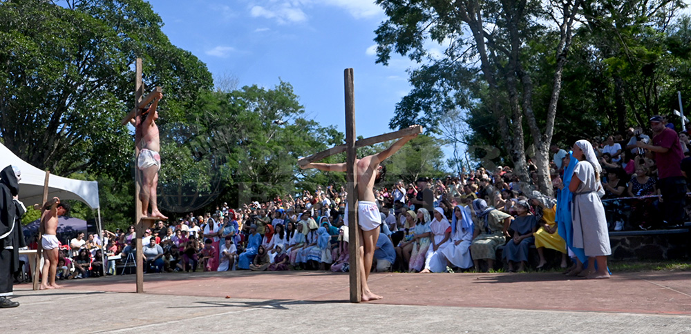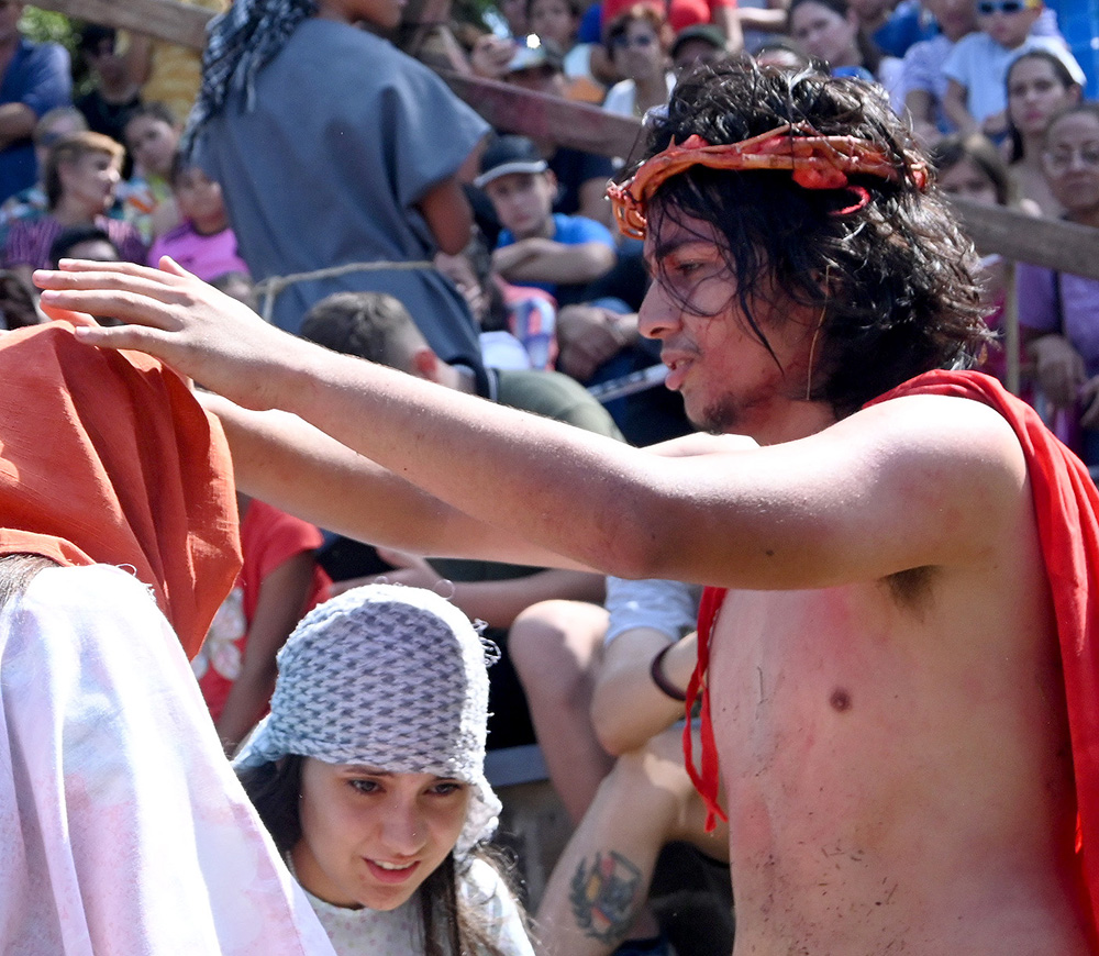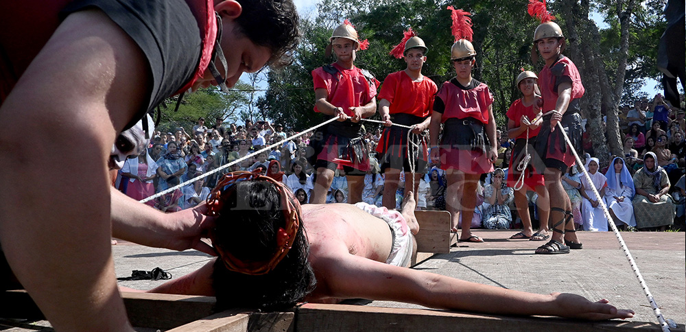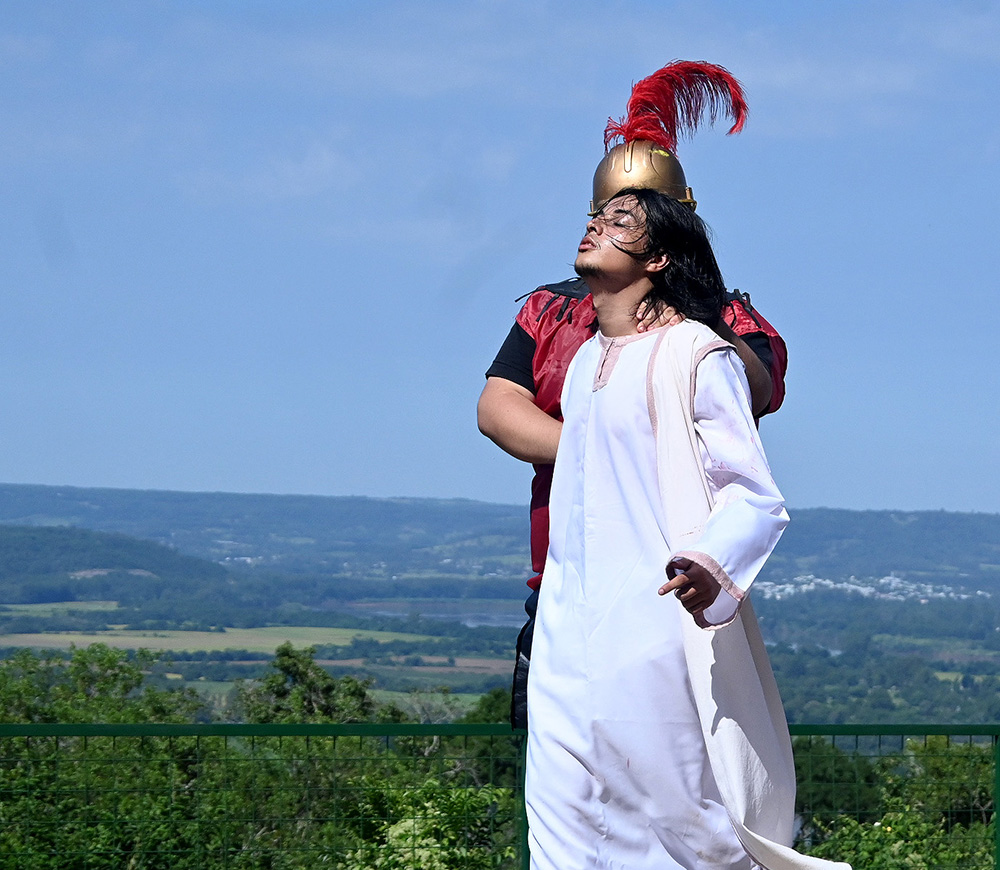 El paso de los vehículos levantaba una cortina de tierra que dejaba casi sin visibilidad a quienes transitaban este viernes por la mañana desde el pueblo hasta el Cerro Monje, donde los jóvenes del Grupo Juvenil Misionero Parroquial representaron el Vía Crucis Viviente en un día a pleno sol y con el río Uruguay de fondo.