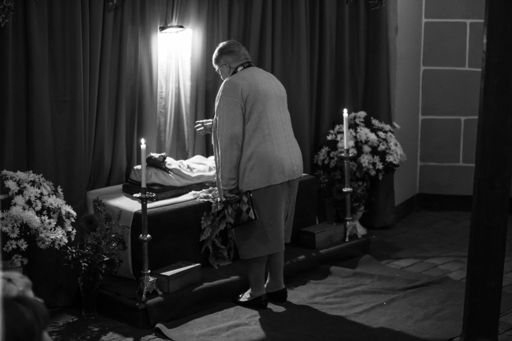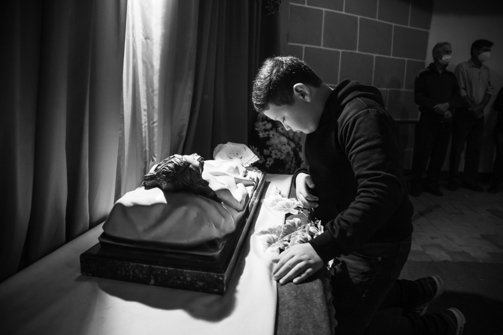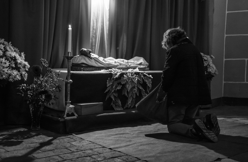 En la cripta precisamente se encuentra una figura del Cristo Yacente que cada Viernes Santo es sacado de ese espacio considerado su sepulcro, iluminado por velas o farolas.