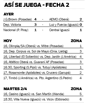Hoy continúa la fecha con Olimpia vs. Mitre, Corpus vs. Sol de Mayo, Libertad vs. Deportivo Jardín América, Atlético Oberá vs. Guaraní, Sporting vs. Tuyutí, Rosamonte vs. Crucero y Timbó vs. Puerto Argentino. El martes, en tanto, irán Casino vs. San Martín y Villa Nueva vs. Vicov.