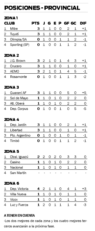 Por último, en el cierre de la jornada, Nacional de Puerto Piray no tuvo el debut esperado, pues igualó 1-1 de local con Central Iguazú, que quedó en la cima de la Zona 5 con dos puntos.