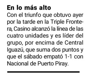Casino Iguazú se transformó ayer por la tarde en el único líder de la Zona 5 del Torneo Provincial 2024 de la Federación Misionera de Fútbol (FeMiFu), tras derrotar por 1-0 a San Martín de Colonia Wanda.