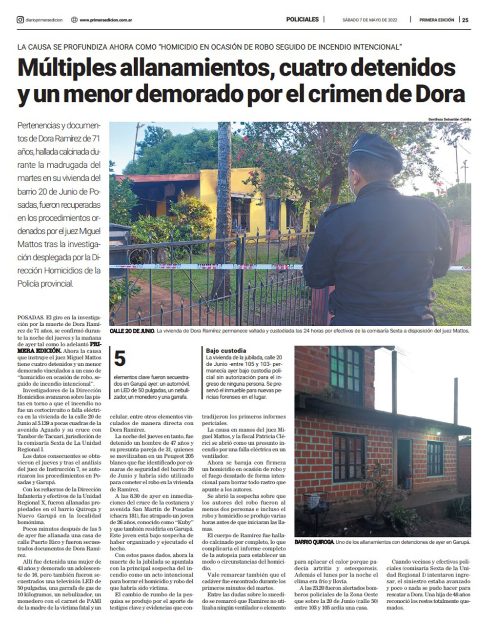 En el allanamiento de una casa de calle Puerto Rico fueron secuestrados documentos de Dora Ramírez. Allí fue detenida una mujer de 43 años y demorado un adolescente, en aquel entonces de 16, pero también fueron secuestrados un televisor Led de 50 pulgadas, una garrafa de gas de 10 kilogramos, un nebulizador, un monedero con el carnet de PAMI y un celular, entre otros elementos vinculados a la víctima.
