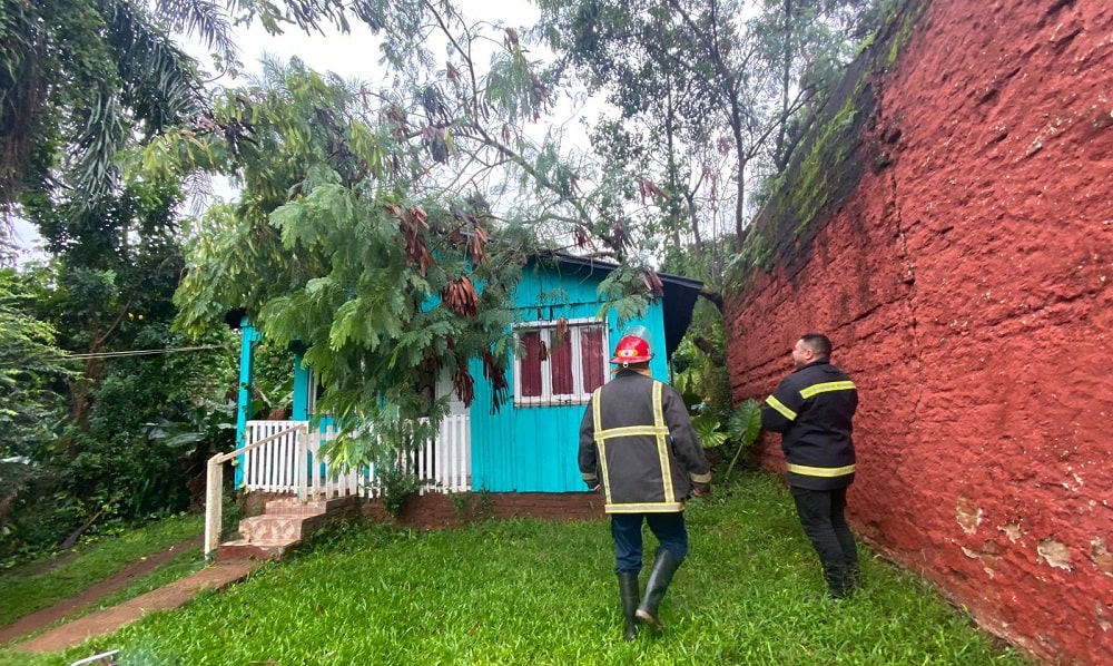 Las intensas precipitaciones y fuertes vientos que se registraron este domingo por la madrugada en la Zona Centro provocaron la caída de un árbol sobre una vivienda de la calle Neuquén de Oberá.