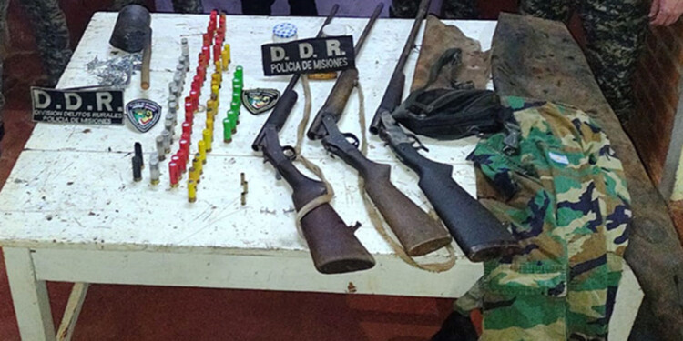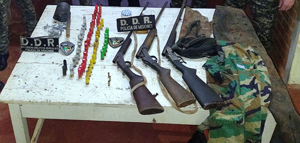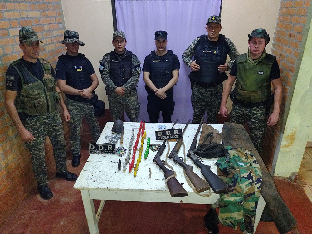 Con la autorización del Juzgado de Instrucción 2 de Eldorado, se realizó el allanamiento donde se encontraron tres armas largas tipo escopeta, alrededor de 50 cartuchos de diferentes calibres, prendas de vestir camufladas, elementos para fabricar munición balística, herramientas para la reparación de embarcaciones tipo piragua y botes, así como dispositivos para esconder armas en el monte, como las trampas cazabobos.