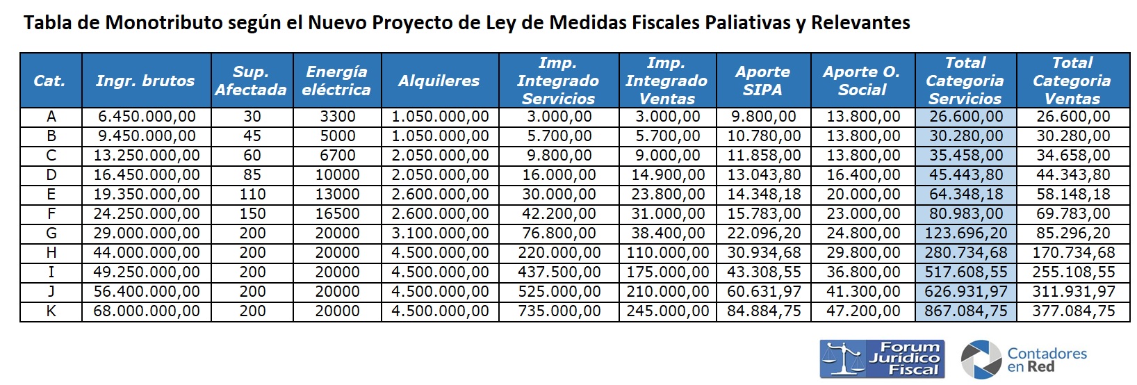 Además, una novedad respecto a los proyectos anteriores, se da en la eliminación de la exclusividad de las últimas tres categorías para la venta de cosas muebles, habilitando también dichas categorías a los prestadores de servicios. Para estos contribuyentes el tope anual de facturación aumenta significativamente hasta los $68 millones.