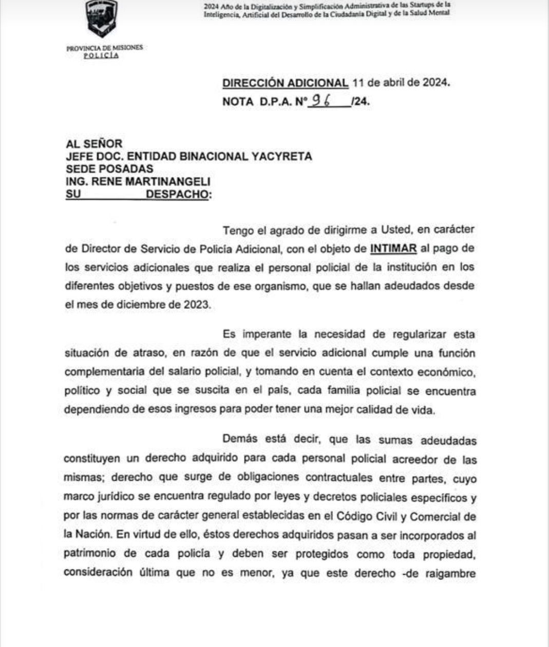 La Jefatura de la Policía de Misiones reclamó a la Entidad Binacional Yacyretá los pagos de cuatro meses de servicios de seguridad adeudados que el organismo mantiene desde diciembre con los guardias asignados en Posadas.