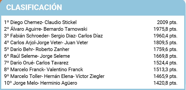 Los que no tuvieron el arranque esperado fueron los campeones de la temporada pasada. Roberto Zanher y Darío Behr terminaron en el quinto lugar, con dos especies menos que los ganadores.