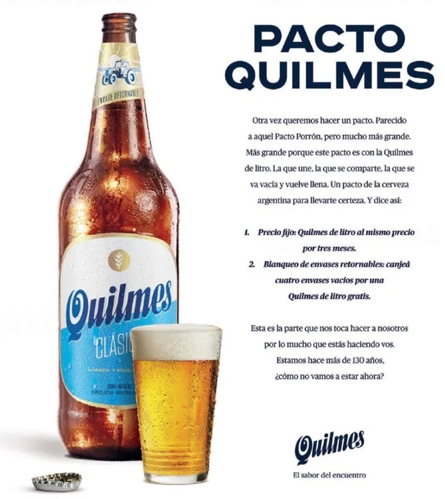 Quilmes, la empresa líder absoluta del mercado cervecero local, se sumó a los supermercados que anunciaron el congelamiento de sus precios hasta terminar el semestre, con el lanzamiento del “Pacto de Quilmes”, mediante el cual el precio de la botella clásica de litro de la marca será mantenido fijo por tres meses.