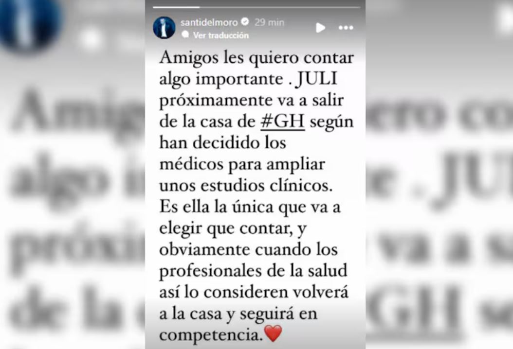 Según el comunicado compartido por del Moro, los médicos han recomendado que Juliana amplíe algunos estudios clínicos fuera de la casa.