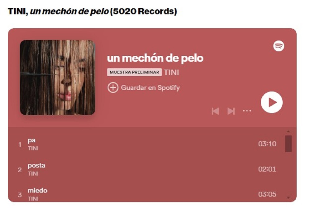 En su proyecto más personal hasta la fecha, la estrella argentina comienza con “pa”, donde comparte el miedo que sintió después de estar a punto de perder a su padre, que también ha sido su mánager durante mucho tiempo. En la canción, pide “un ratito más” con su papá. Producido en su mayoría por Andrés Torres y Mauricio Rengifo, el álbum, despojado y con una fuerte carga lírica, sigue a TINI en sus momentos de vulnerabilidad, dolor, resiliencia, renovación y crecimiento. En “posta”, recita poderosas declaraciones en las que aclara quién es y quién no es. Pero quizá el tema más impactante de un mechón de pelo sea “miedo”, que parece una entrada de diario en la que TINI mira hacia su interior y traza los altibajos de su carrera y su vida personal. “Querer volver el tiempo y volver a empezar/ Me escapé de mi realidad, me encerré en mi soledad/ Y eso de volver a empezar ni lo puedo empezar”, confiesa. Tras las primeras canciones que sirven de desahogo, TINI inicia el proceso para sanar. En los tres últimos temas, “ellas”, “bien” y “me voy”, abraza sus heridas de batalla y tiene una visión más optimista del futuro. “Ahora estoy chill, nada es personal/ A mis amigas quiero llamar/ Se siente bien poder perdonar/ Se siente bien volver a empezar”, canta en “bien”. El álbum termina con “me voy”, una canción a piano que sirve de cierre perfecto. (Griselda Flores -Billboard-)