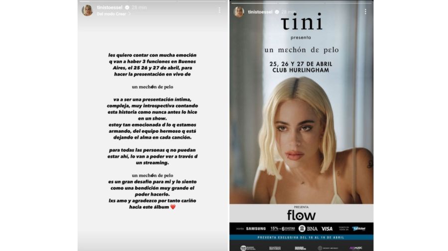 La cantante argentina Tini Stoessel anunció tres fechas en Buenos Aires para presentar su nuevo álbum, “Un mechón de pelo”, en vivo. A través de sus redes sociales, la artista dio detalles sobre las presentaciones que hará en forma escrita.