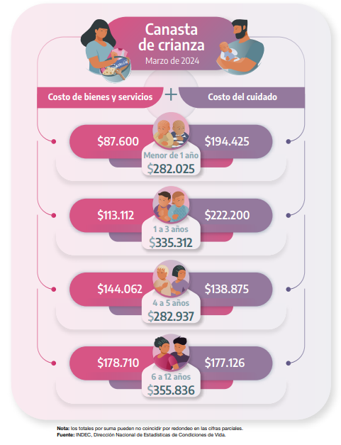 Los incrementos fueron de entre 31,73% y 46,61%, según cada rango etario. De esta manera, para los menores de 1 año el costo para marzo fue de $ 282.025; para los menores de 1 a 3 años, $ 335.312; de 4 a 5 años, el costo de crianza alcanzó los $ 282.937 y para los menores de 6 a 12 años, el monto de la canasta alcanzó los $ 355.836.