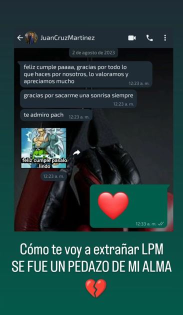 “Cómo te voy a extrañar LPM. Se fue un pedazo de mi alma”, escribió en su último posteo donde compartió el mensaje que recibió en su cumpleaños de Juan Cruz.