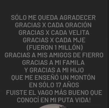 “Solo me queda agradecer. Gracias por cada oración, gracias por cada velita. Gracias por cada mensaje (fueron 1 millón). Gracias a mis amigos de fierro. Gracias a mi familia y a mi hijo que me enseñó un montón en solo 17 años”, expresó.