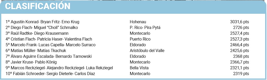 Los excampeones provinciales terminaron segundos, detrás de un equipo de Hohenau, pero por corrimiento quedaron primeros para el Provincial. Los montecarlenses Diego Krausemann y Raúl Radtke se recuperaron del traspié de la primera fecha y se ubicaron terceros en la clasificación.