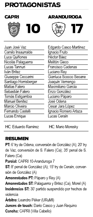 Con el correr de los minutos, CAPRI retomó el control del juego y con los delanteros comenzó a meter a las “Cebras” contra su propio ingoal. El “Azzurro” estaba a tiro de empate, cuando se desencadenaron los hechos que llevaron al árbitro Péker a decidir la suspensión del partido, cuando faltaban diez minutos. Un final lamentable para un partido que estaba bueno.
