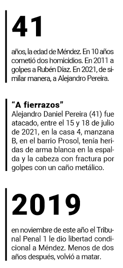 Méndez conoció a Pereira en la Unidad Penal de Loreto del Servicio Penitenciario Provincial. “Mangueruli” estuvo preso allí y condenado por el Tribunal Penal 1 por asesinar a Rubén Díaz (54) en 2011 en el complejo habitacional A4, también a fierrazos y a su presunto amigo y compañero para beber.