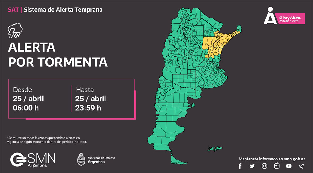 El Servicio Meteorológico Nacional (SMN) lanzó para este jueves alertas por tormentas fuertes, con posible caída de granizo, para diferentes localidades del norte del país. El aviso es un alerta amarillo que alcanza al sur y centro de Misiones; al centro, oeste y norte de Entre Ríos; todo Corrientes; centro y norte de Santa Fe; y este de Chaco.