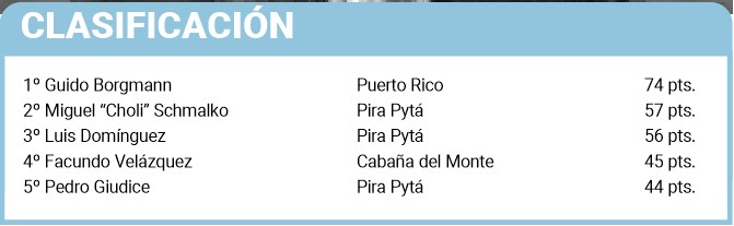 Guido Borgmann (foto) sumó 74 puntos y se quedó con el trofeo mayor. El pescador de Puerto Rico tuvo el mismo arranque que en la pesca embarcada. Es que a mediados de marzo, en Montecarlo, también se quedó con el escalón más alto del podio junto a Adrián Guerrero, demostrando que está pasando por un gran momento en lo deportivo.