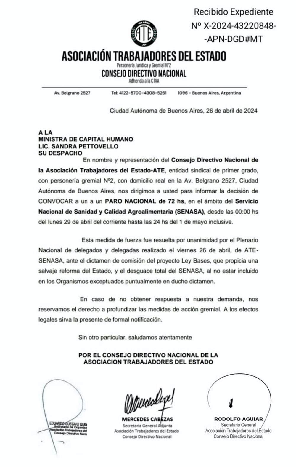 La Asociación Trabajadores del Estado (ATE) convocó a un paro de 72 horas en el Servicio Nacional de Sanidad y Calidad Agroalimentaria (SENASA), comenzando a partir de la hora 0 del próximo lunes 29 de mayo. Esta medida de fuerza resultará en la paralización de las exportaciones y los controles sanitarios en todo el país.