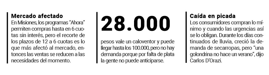 “Las caídas de las ventas son preocupantes, la gente compra algo si necesita urgente. No se vende nada más allá de eso, por ejemplo en estos días de lluvia se vendieron un poco más de secarropas, pero esa golondrina no hace un verano. En cuanto a los artículos de calefacción, que arrancan desde los 28 mil pesos, todavía no hay ni consultas y muchos menos compras”.