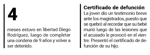 Al momento del testimonio de la víctima fue poco lo que pudo mencionar, puesto que se quebró al recordar que había perdido a su hijo producto de la golpiza. En ese momento estaba con cinco meses de gestación y mencionó que el bebé “estaba todo negro”, cuando se lo sacaron del vientre, luego que Rodríguez la pisoteara.