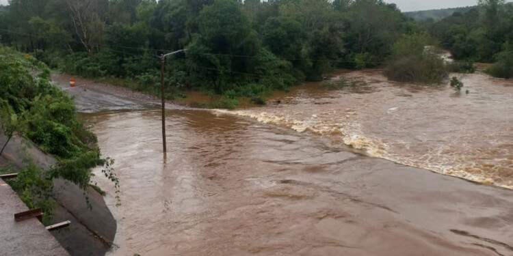 El tránsito sobre el puente provisorio que atraviesa el arroyo Tabay, que une a los municipios de Jardín América y Aristóbulo del Valle, se encuentra actualmente interrumpido debido a la crecida del caudal de agua del mencionado arroyo, que ha sobrepasando completamente la calzada.